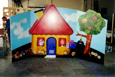 #6    The All New Captain Kangaroo back yard set scenically painted  clap board walls, ginger bread porch detail custom built Dutch door with   faux grass, leading to 12' tall sway back decorative shed and custom  stucco rolling fence wall planter units in back ground.    Sold