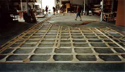 #1    Food Groupies PBS children's pilot show set (kitchen) 16x20'. Kitchen area with faux wall treatment, heavy trim detail recessed arched bookcases with custom raw moldings faux finished cabinetry laminated countertops and checkerboard vinyl floor.    Sold